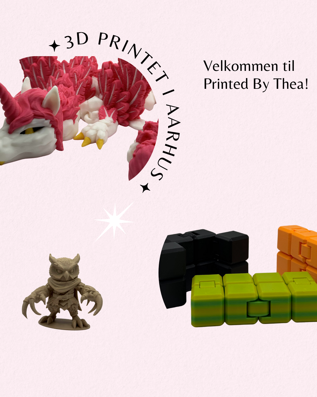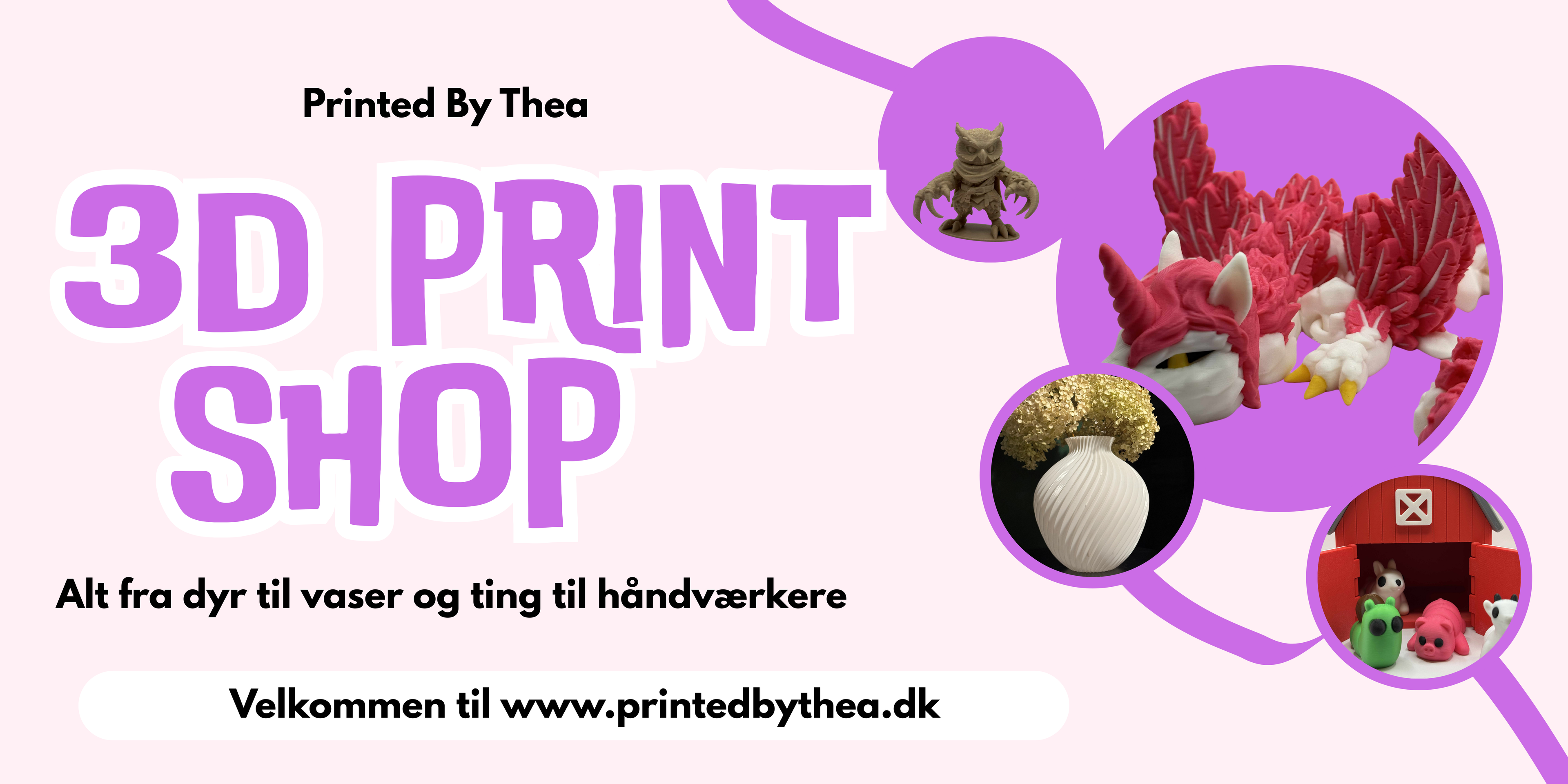 Printed By Thea startede med Thea der fik en god idé og købte en 3D printer, efterfølgende fik vi hurtigt produceret nok produkter og måtte tage på nogle loppemarkeder for at afsætte varerne. Det hyggede vi os med og vi har derfor valgt at alle skal kunne have glæde af vores 3D print produkter. Så Printed By Thea består af Thea og Walde der bor i Aarhus.